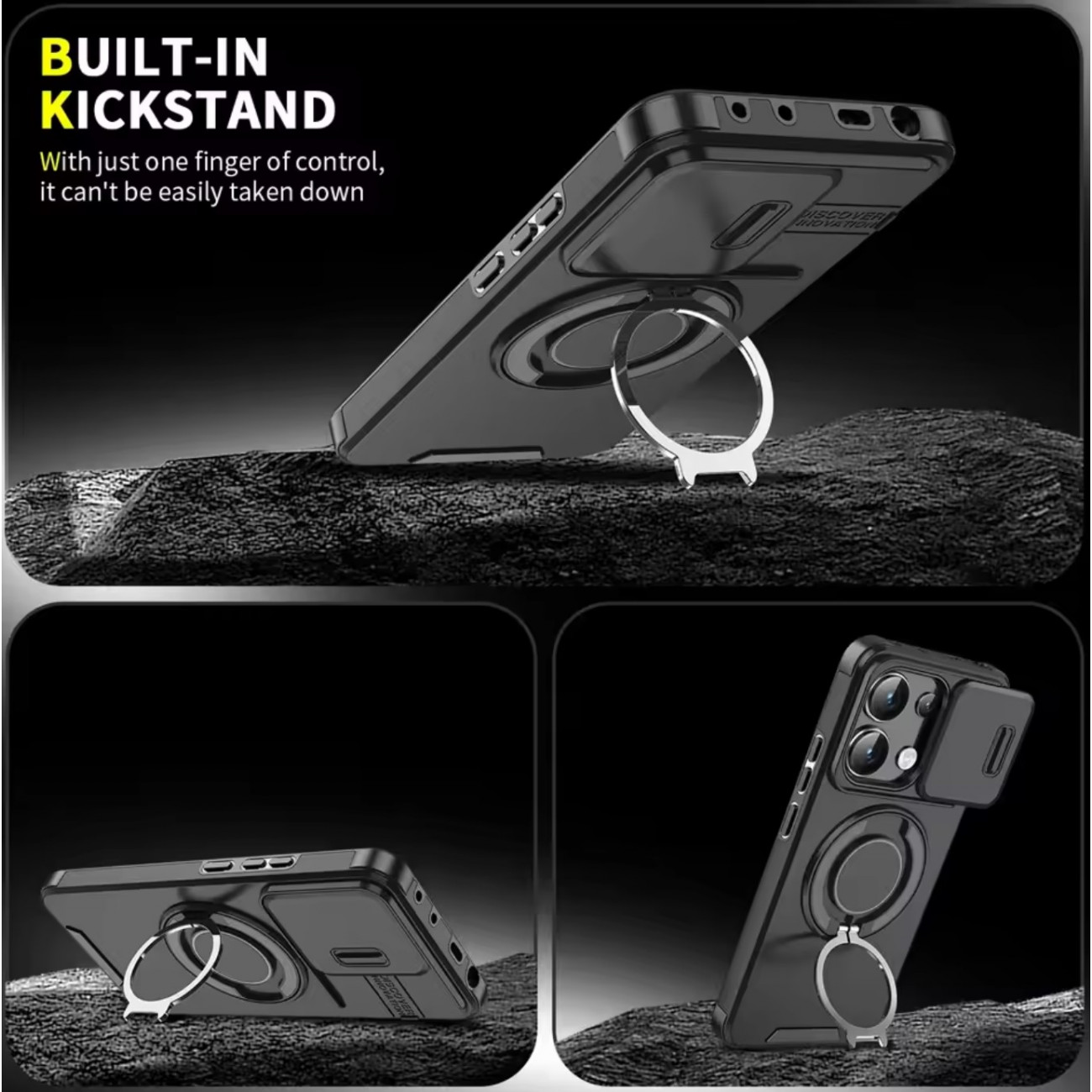 Протиударний чохол Camshield для Xiaomi Redmi 14C з кільцем-тримачем – це гібридний бампер, який допоможе захистити ваш смартфон від будь-яких механічних пошкоджень. Основа цього чохла - це якісна силіконова частина, яка дбайливо захищає корпус смартфона. Зверху закріплена пластикова частина з декоративними елементами та вбудованим кільцем-тримачем. Силікон та пластик надійно фіксуються між собою завдяки спеціальним пазам. Крім того, цей бампер на кілька міліметрів виступає над телефоном, що забезпечує додатковий захист.