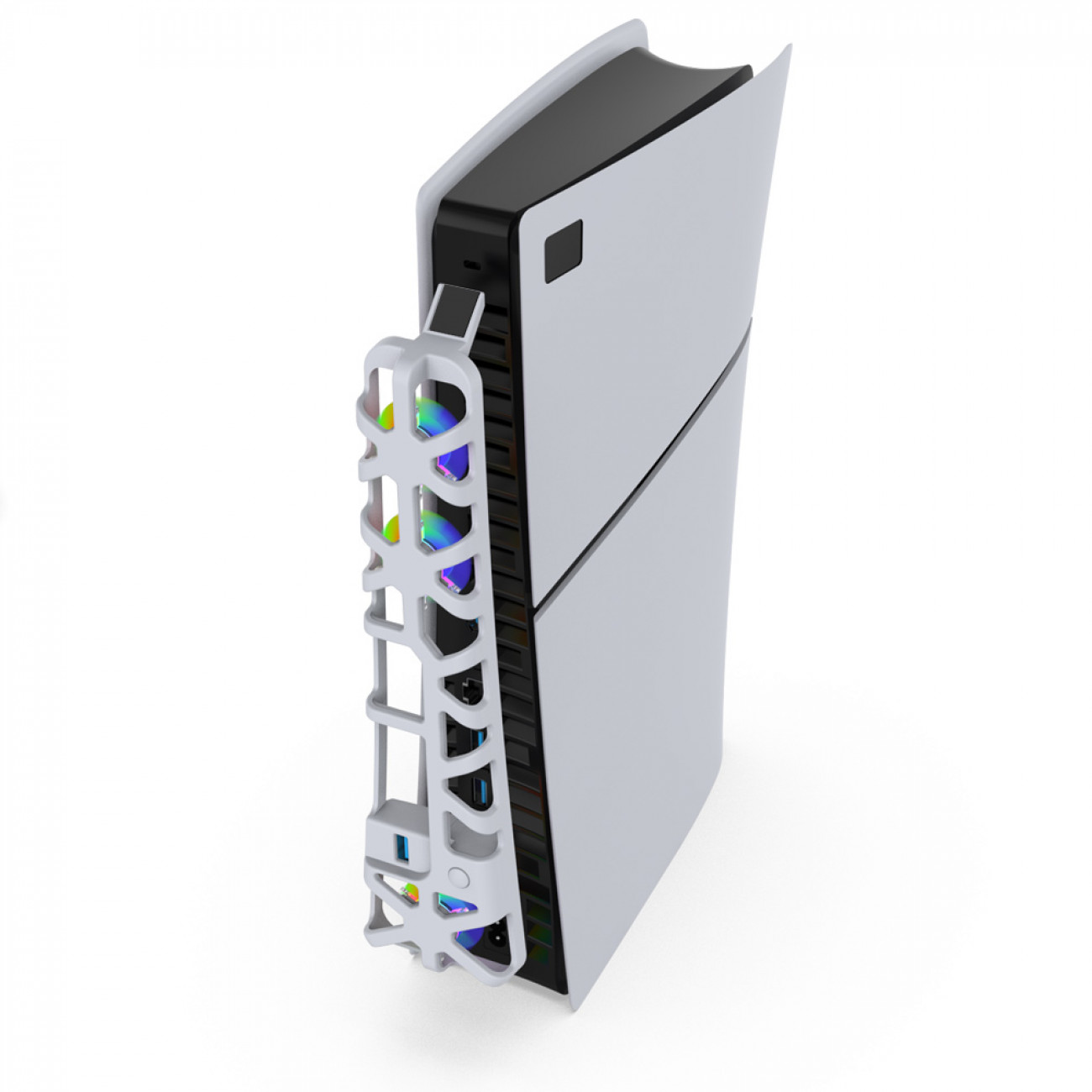 Модель оснащена трьома високопродуктивними вентиляторами, що забезпечують рівномірне охолодження всієї консолі. Система працює у чотирьох швидкісних режимах, що дозволяє обирати між тихим або інтенсивним охолодженням залежно від ігрового навантаження. Потік повітря спрямований безпосередньо на гарячі зони PS5 Slim, запобігаючи перегріванню процесора та графічного модуля.