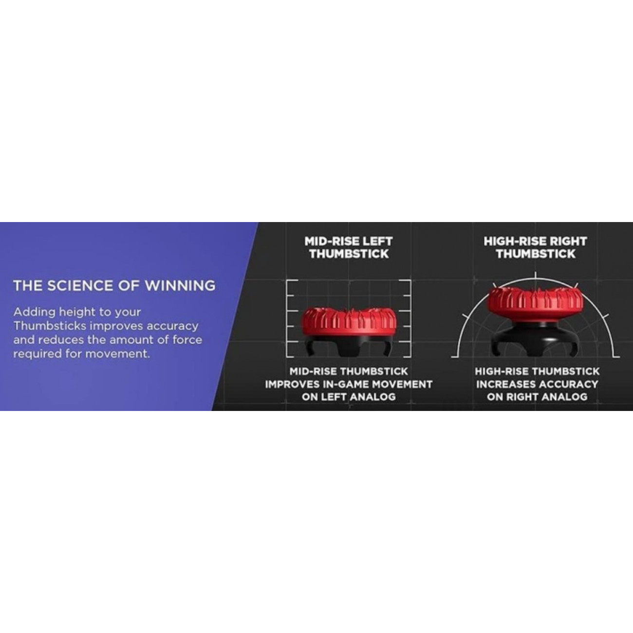 Набір виконаний у форматі Mixed-Rise і включає дві накладки різної висоти, що дозволяє гнучко налаштувати управління під власний стиль гри. High-Rise (+10 мм) збільшує діапазон руху стику, забезпечуючи більш точні мікрорухи та стабільніше прицілювання. Mid-Rise (+6,5 мм) є універсальним варіантом, що поєднує швидку реакцію та контроль, що підходить для більшості жанрів.