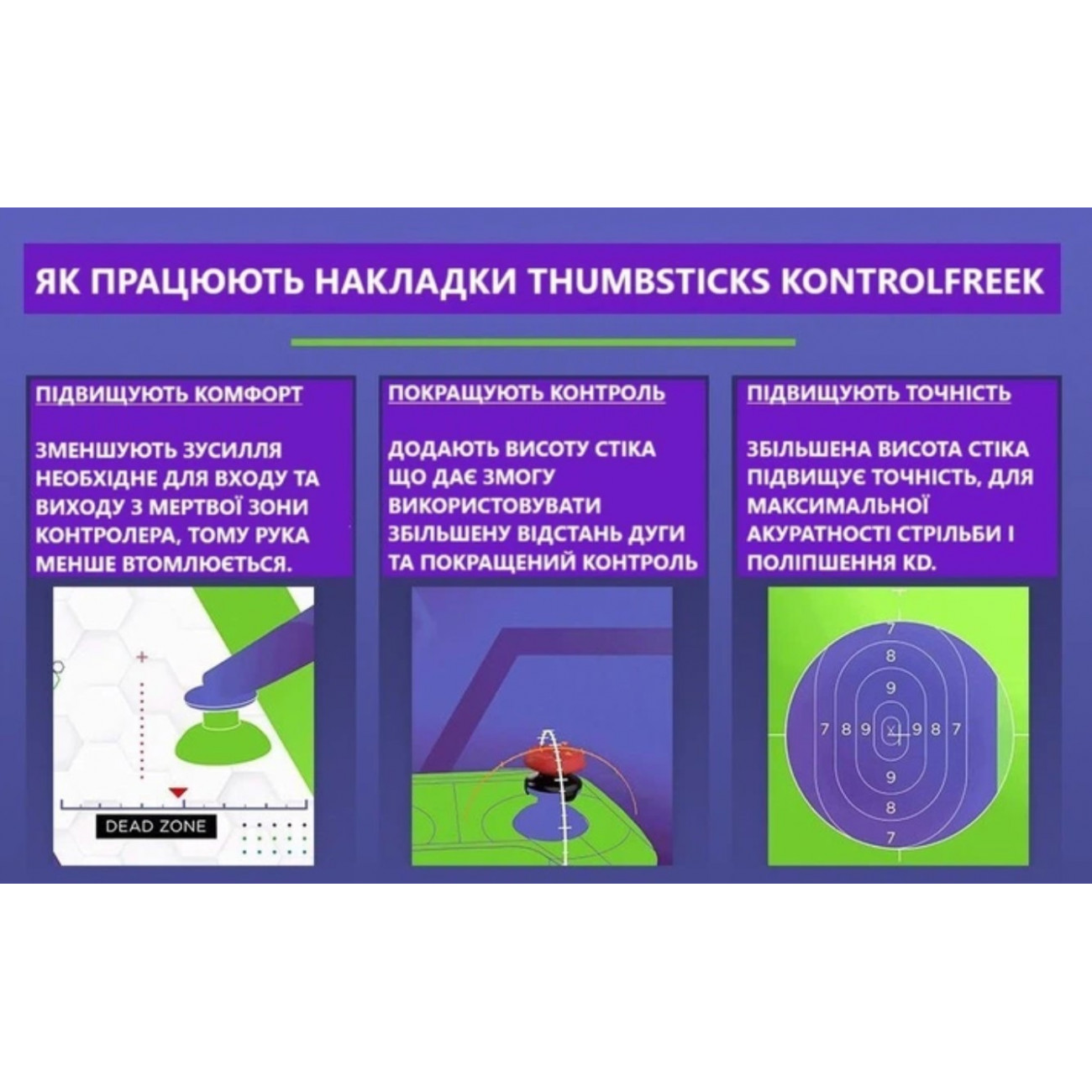 Накладки швидко та легко встановлюються, щільно фіксуються на стеках та не вимагають жодних інструментів. Вони повністю сумісні з Sony DualShock 4 (PS4) та Sony DualSense (PS5) , не впливають на роботу кнопок і не знижують чутливість контролера.